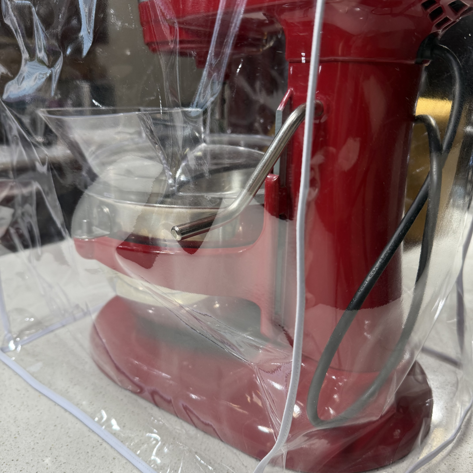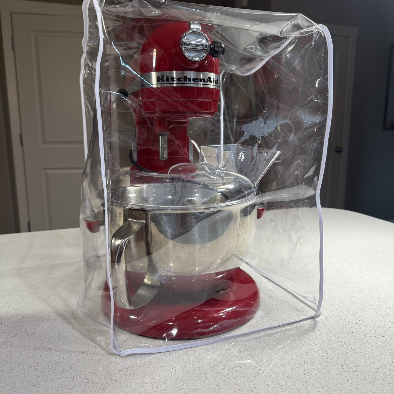 KitchenAid® Dust Cover in Clear Vinyl - sized to fit your stand mixer just right. The dust cover is made out of 10 gauge clear vinyl and trimmed in either white or black.